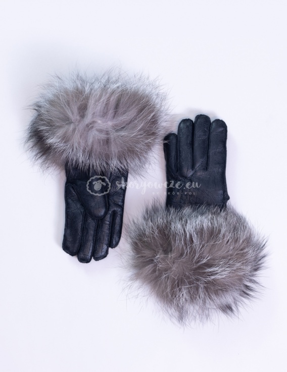 Czarne rękawiczki damskie ze skóry jagnięcej z szarym futerkiem z szynszyla