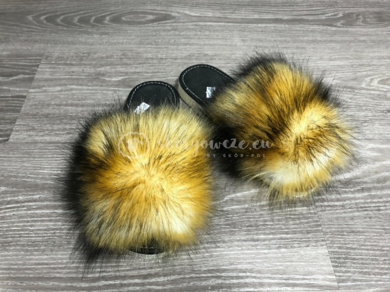 Stylowe klapki domowe z miękkim, sztucznym futerkiem imitującym futro lisa i jenota. Wygodna podeszwa z gumy PCV oraz czarna wkładka zapewniają komfort użytkowania. Szeroki pasek z futerkiem dobrze dopasowuje się do stopy.