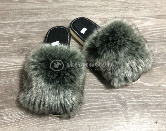 Stylowe klapki domowe z miękkim, sztucznym futerkiem imitującym futro lisa i jenota. Wygodna podeszwa z gumy PCV oraz czarna wkładka zapewniają komfort użytkowania. Szeroki pasek z futerkiem dobrze dopasowuje się do stopy.